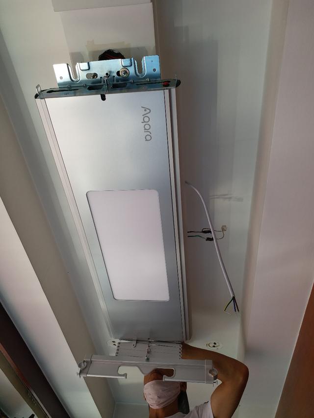 ▲然后,将Aqara智能晾衣机Lite机器本体安装在吊顶上,同时,将电源线接在房顶预留的电线上。