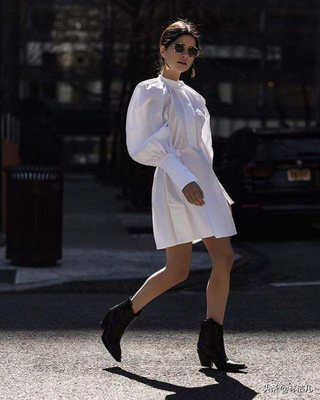 建议大家首选高腰款的衬衫裙,不需要过多的色彩花纹装饰,再搭配短靴,能让整体造型碰撞出奇妙的火花。